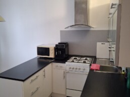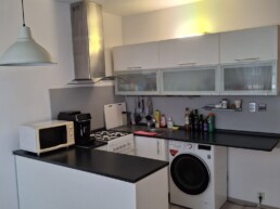 - Spotřebiče v ceně: Plynový sporák s troubou, digestoř, mikrovlnná trouba, pračka pod pracovní deskou a lednice s mrazákem.