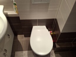 - Moderní obklady a dlažba, snížený strop s integrovaným bodovým osvětlením.