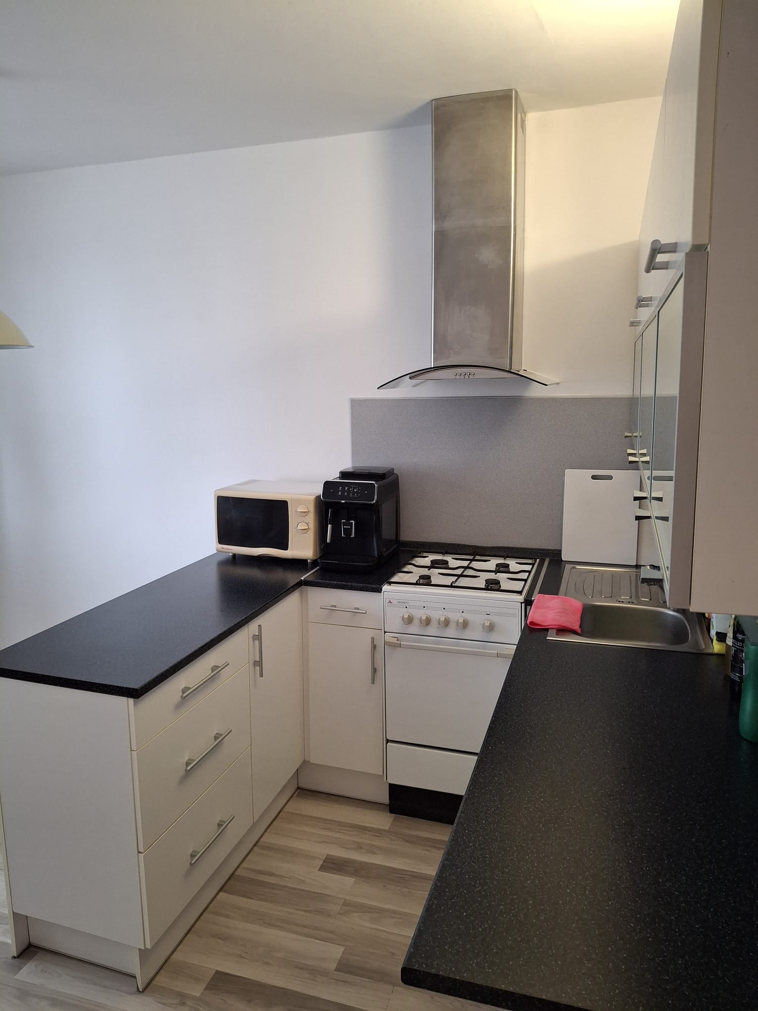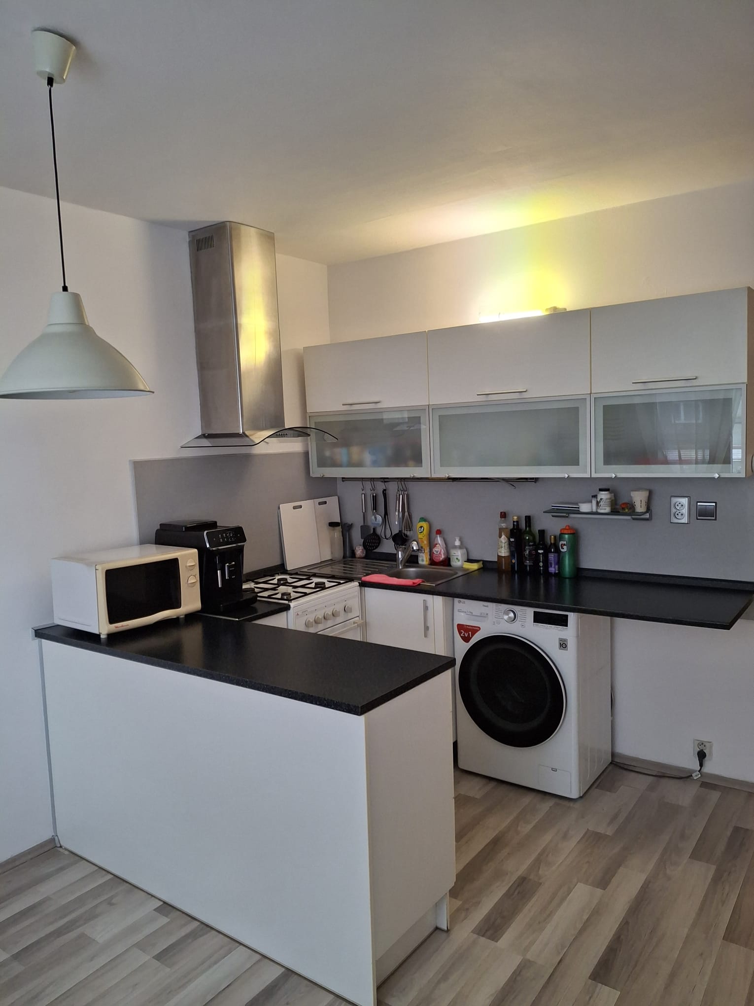 - Spotřebiče v ceně: Plynový sporák s troubou, digestoř, mikrovlnná trouba, pračka pod pracovní deskou a lednice s mrazákem.