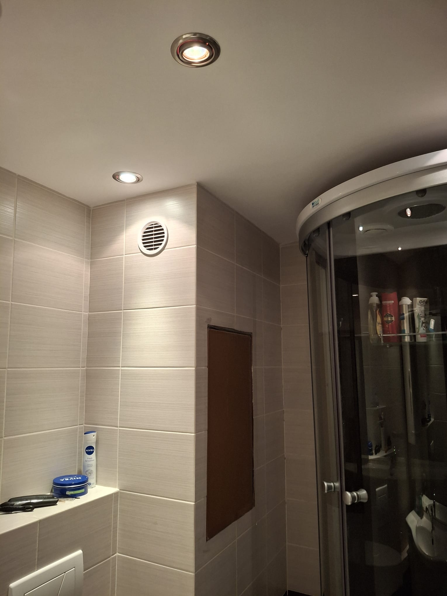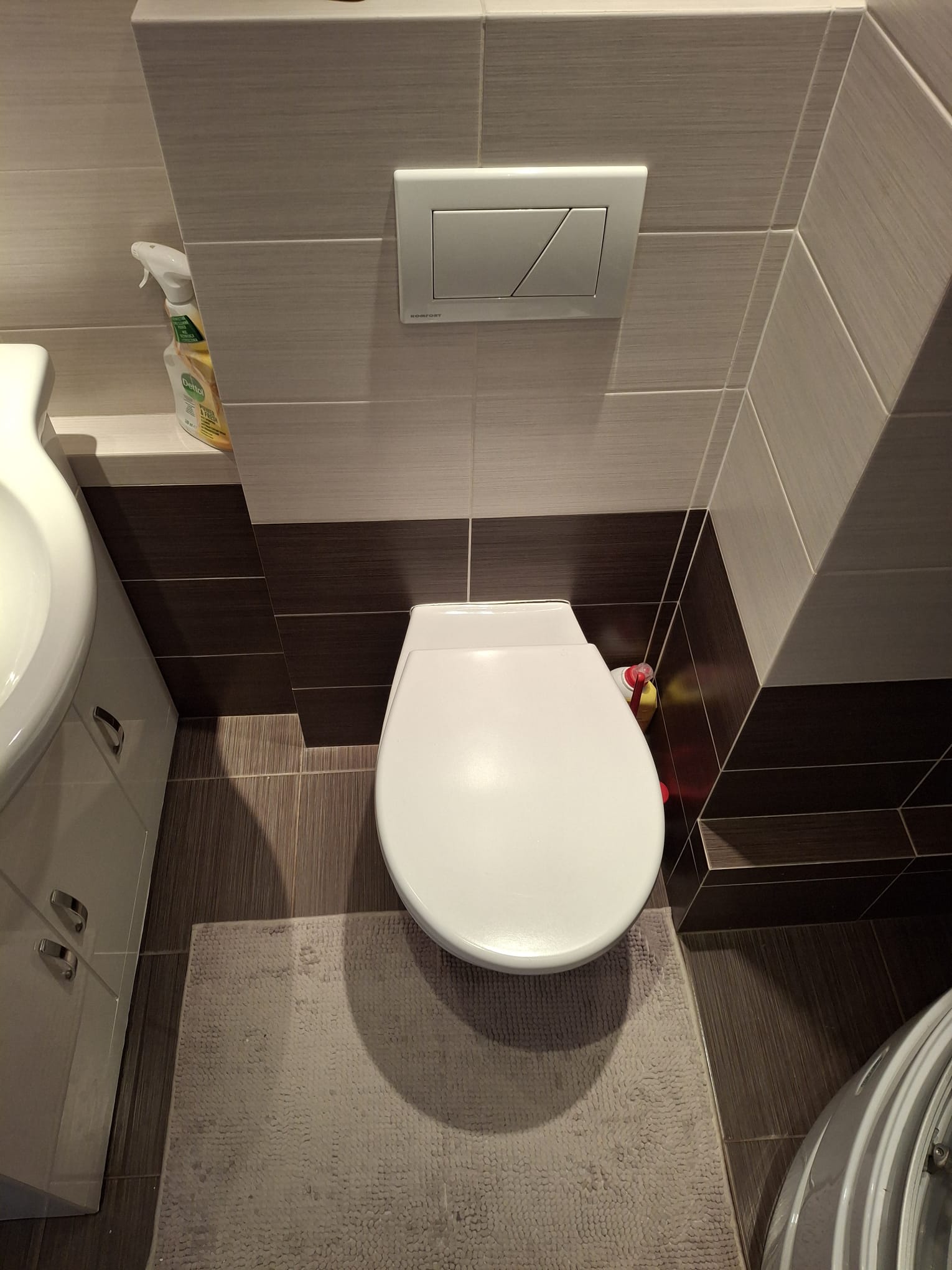 - Moderní obklady a dlažba, snížený strop s integrovaným bodovým osvětlením.