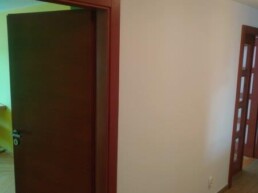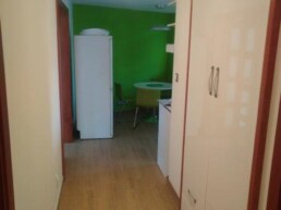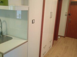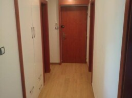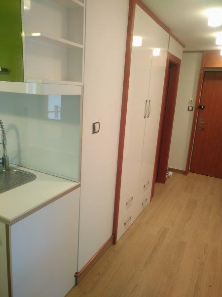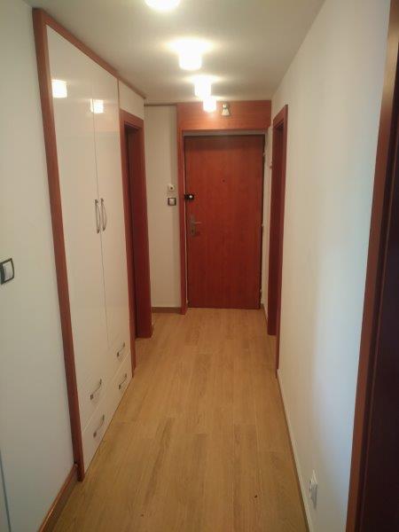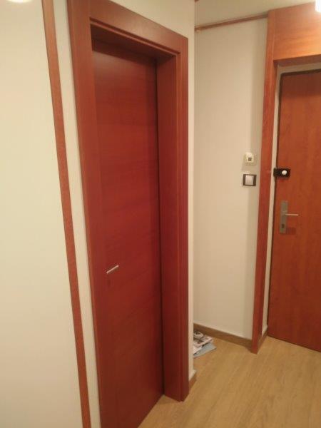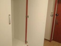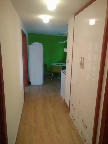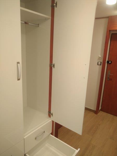 Za vstupními dveřmi vstupní chodba: vpravo nika na odkládání svršků a obuvi, Vestavěná hluboká skříň s šatní tyčí a zásuvkami ve spodní části – plnovýsuv, zhotoveno na míru jako zakázková výroba v bílé barvě ve vysokém lesku. Vpravo vstup do sociálního zařízení, vlevo vstup do ložnice. Termostaticky ovládané elektrické vytápění podlahy.