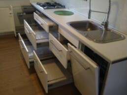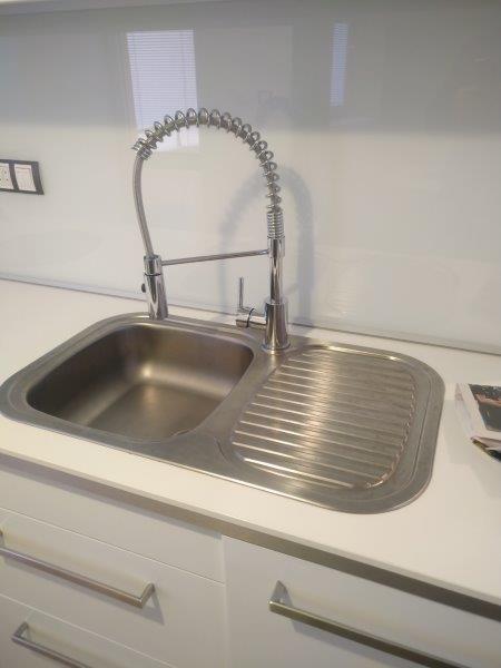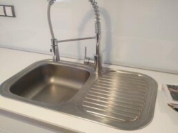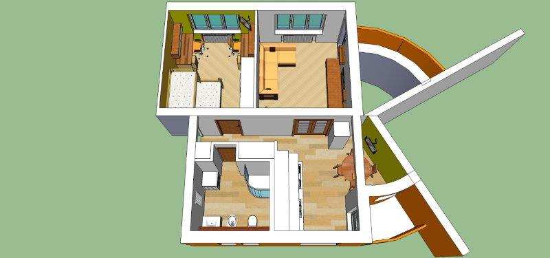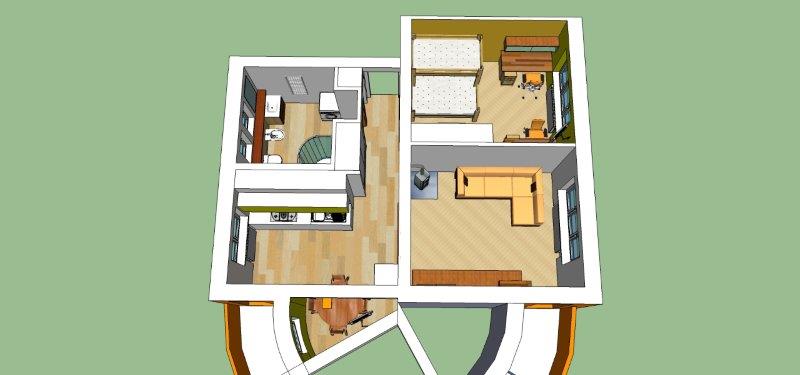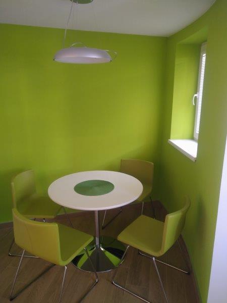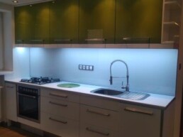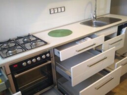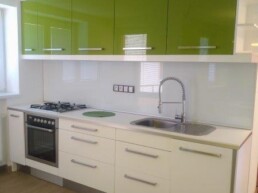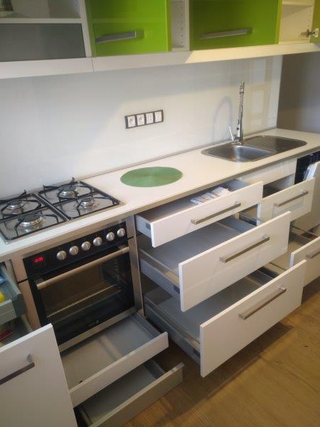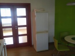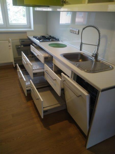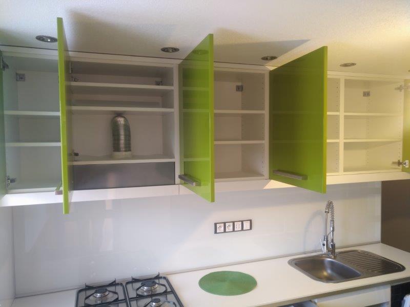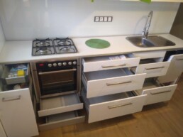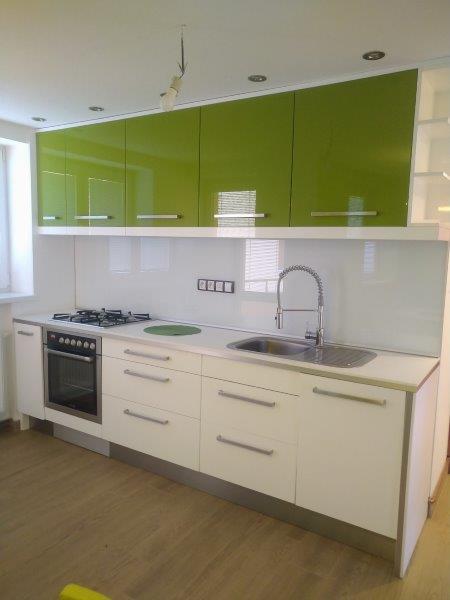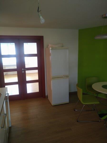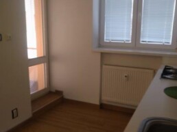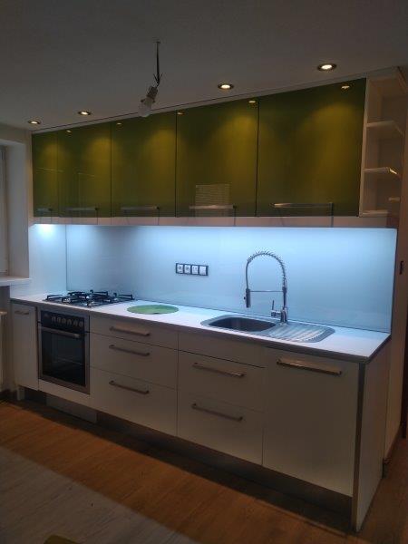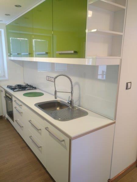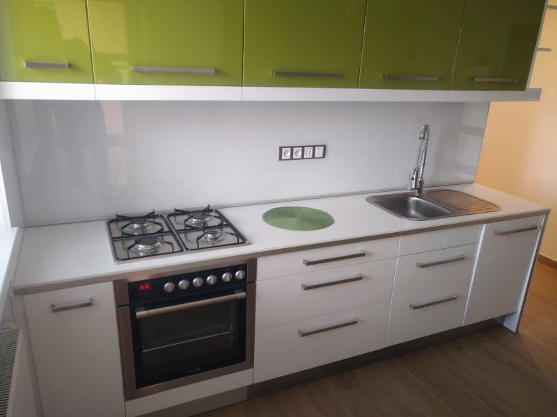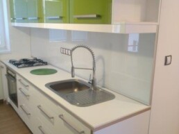 - Kuchyně s jídelnou na konci chodby. Termostaticky ovládané elektrické vytápění podlahy. Kuchyňská linka Ikea, dvířka ve vysokém lesku s tlumiči zavírání, zásuvky plnovýsuvy. Komfortní pracovní deska, nerezový dřez s odkapávačem a se stojánkovou baterií a flexibilní sprchou. „Záda“ pracovní desky v celé šíři kuchyňské linky – Lacobel (sklo s bílým dekorem), horní části osazena AL kolejnice Wirelli pro závěsný a odkládací systém. LED dotykově ovládané osvětlení pracovní desky. Bodové osvětlení ve stropním podhledu v linii kuchyňské linky. Výkonná výsuvná digestoř s osvětlením. Nerezový plynový sporák s piezoelektrickým zapalováním, elektrická trouba, pod troubou 2 zásuvky na příslušenství. Myčka nádobí 40 cm. Zásuvky na troubu, MW troubu a myčku s vlastními jištěnými okruhy. Z kuchyně vstup na balkon směrovaný do parku obytného bloku. Jídelna – nově vzniklý prostor po vybourání spíže, neotřelý půlkruhový půdorys. Vývod osvětlení jídelního stolu se stmívačem.