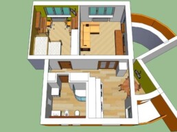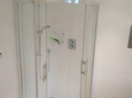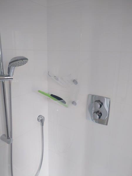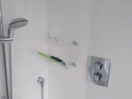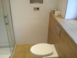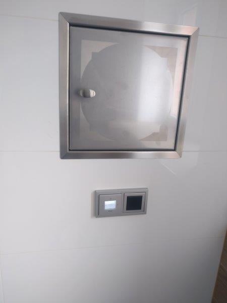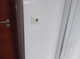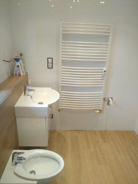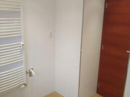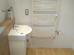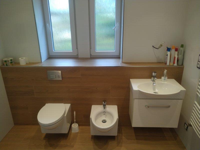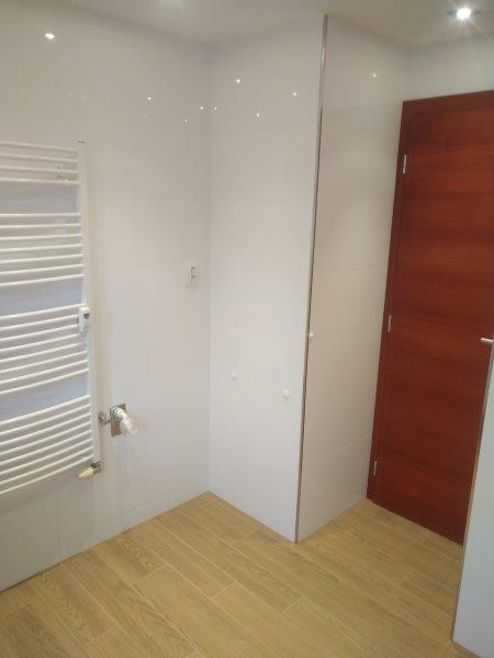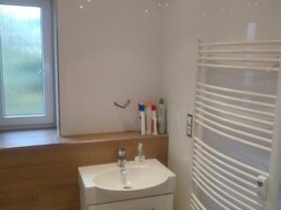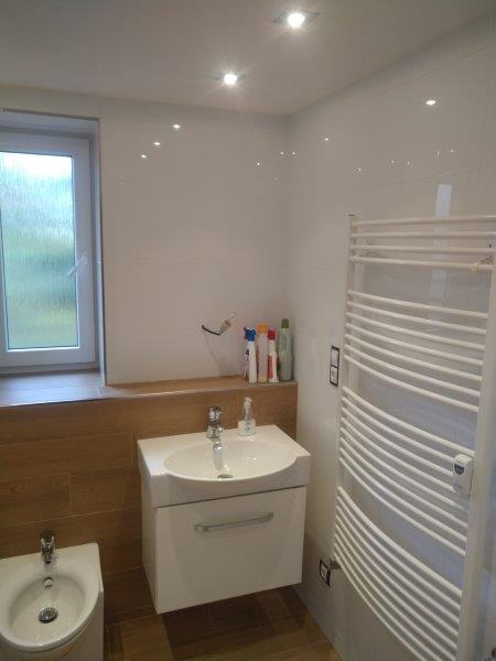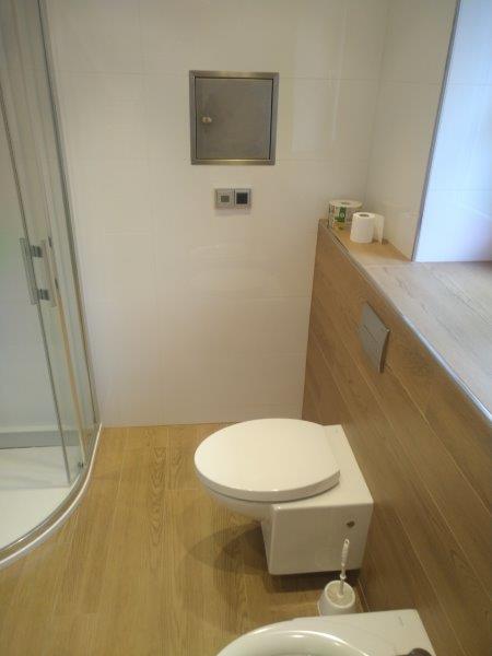 - Komfortní sociální zázemí: se sprchovým koutem s termostatickou baterií, hlavovou a ruční sprchou, pojezdy skleněných dveří v ložiskách. Připravený vývod pro připojení pračky, otopný žebřík, skříňka pod umyvadlem zhotovená na zakázku ve vysokém lesku. Umyvadlo, bidet a závěsné WC ve vysokém standardu. Nerezové ovládání splachovače. Kvalitní pákové baterie. Vestavěné digitální rádio ABB. Kontrolní a revizní šachta přístupná přes nerezová dvířka. Termostaticky ovládané elektrické vytápění podlahy. Dostatečně dimenzované a kvalitní bodové osvětlení v podhledu. Kvalitní rektifikovaný velkoplošný obklad ve vysokém lesku s minimální spárou. Nad umyvadlem spínaný vývod pro osvětlení umyvadlové skříňky + vyhřívání zrcadla.