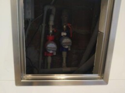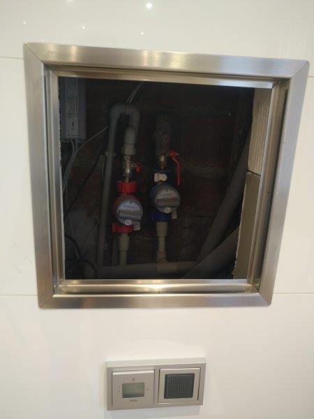 - Rozvody vody PPR, po kompletní výměně, vodoměry a uzávěry přístupné revizními dvířky v sociálním zařízením