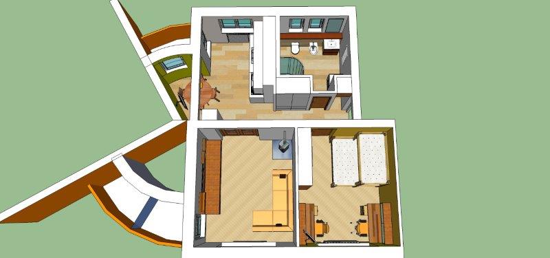 - Digestoř výsuvná s osvětlením. Odtah zaústěn do nevyužitého sopouchu stávajícího komínového tělesa.